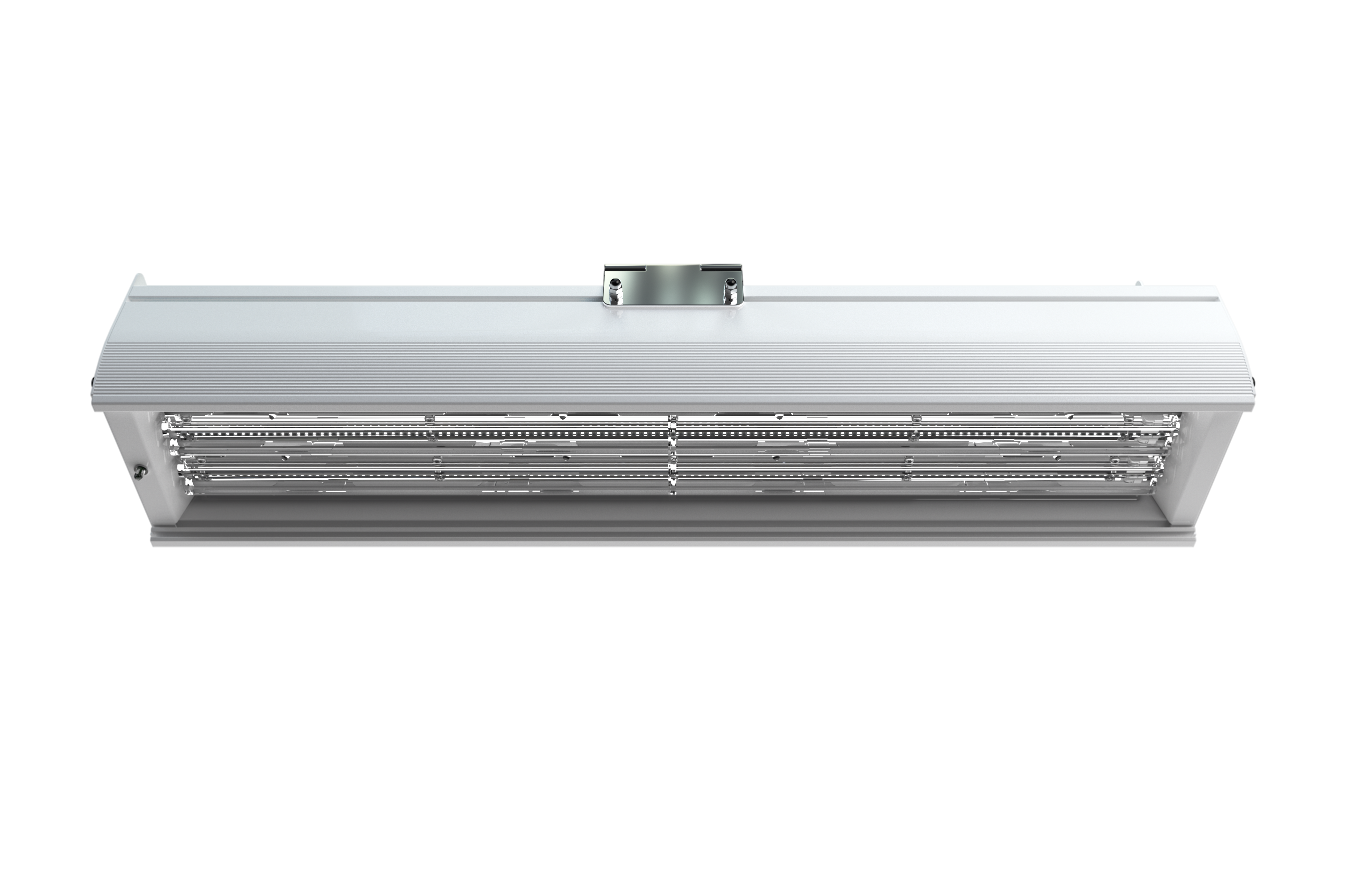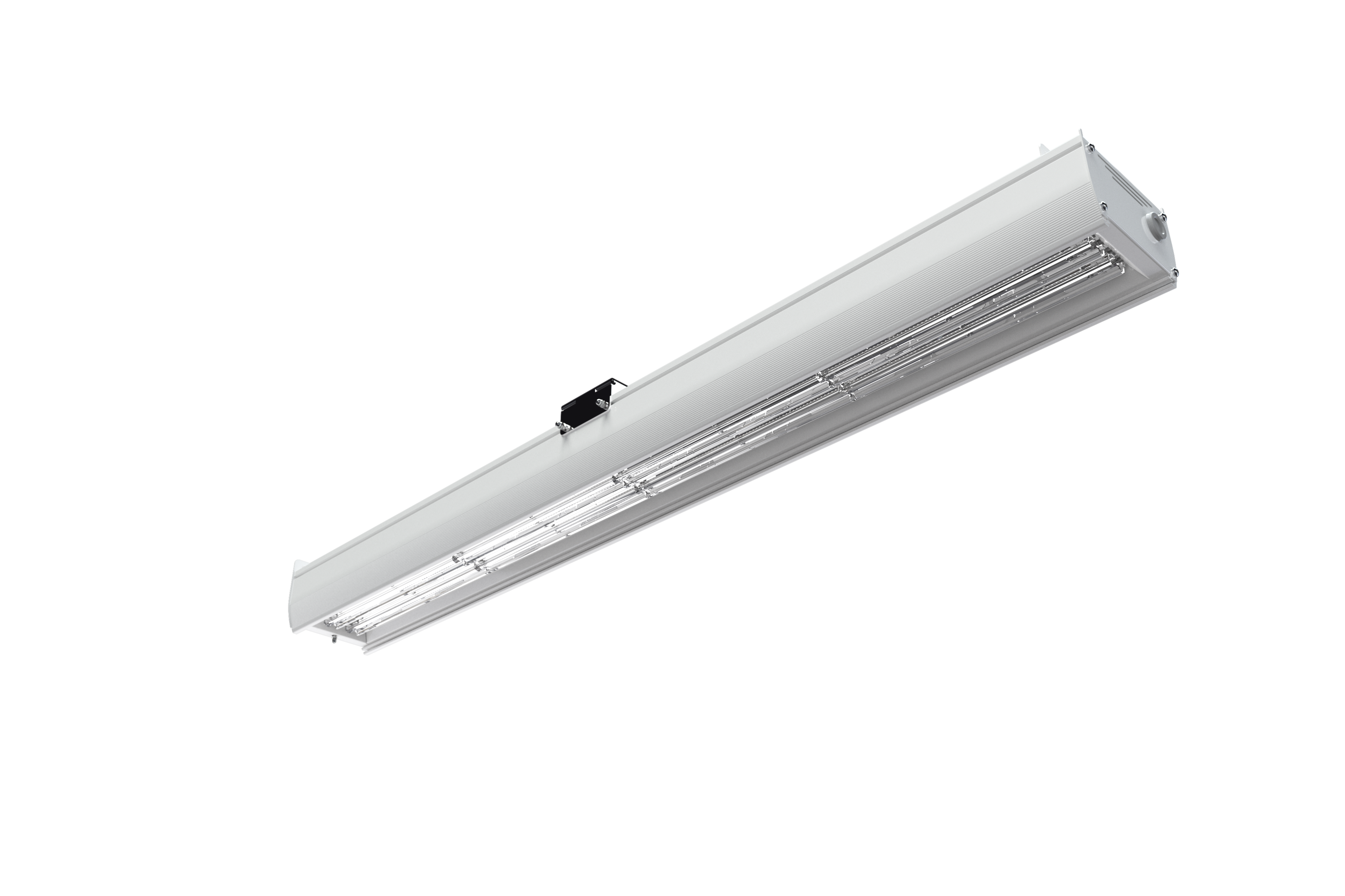Holophane HI-BEAM consists of a 6063-T6 Aluminium extruded body and steel end-caps finished in polyester power-coated Smooth White (RAL9016). The LED optical arrangement includes bespoke LED boards behind PMMA optics. The luminaire shall be sealed to IP20. Drivers and LEDS are mounted directly to the aluminium body to promote excellent thermal characteristics. Mounting of the luminaire is via a universal mounting bracket or via the integrated suspension mount points. The bracket includes a hinge to allow it to be put in a service position and features a snap-fit plastic cover to enable easy entry to gear and components. Cable entry is via either side or top membrane cable glands.